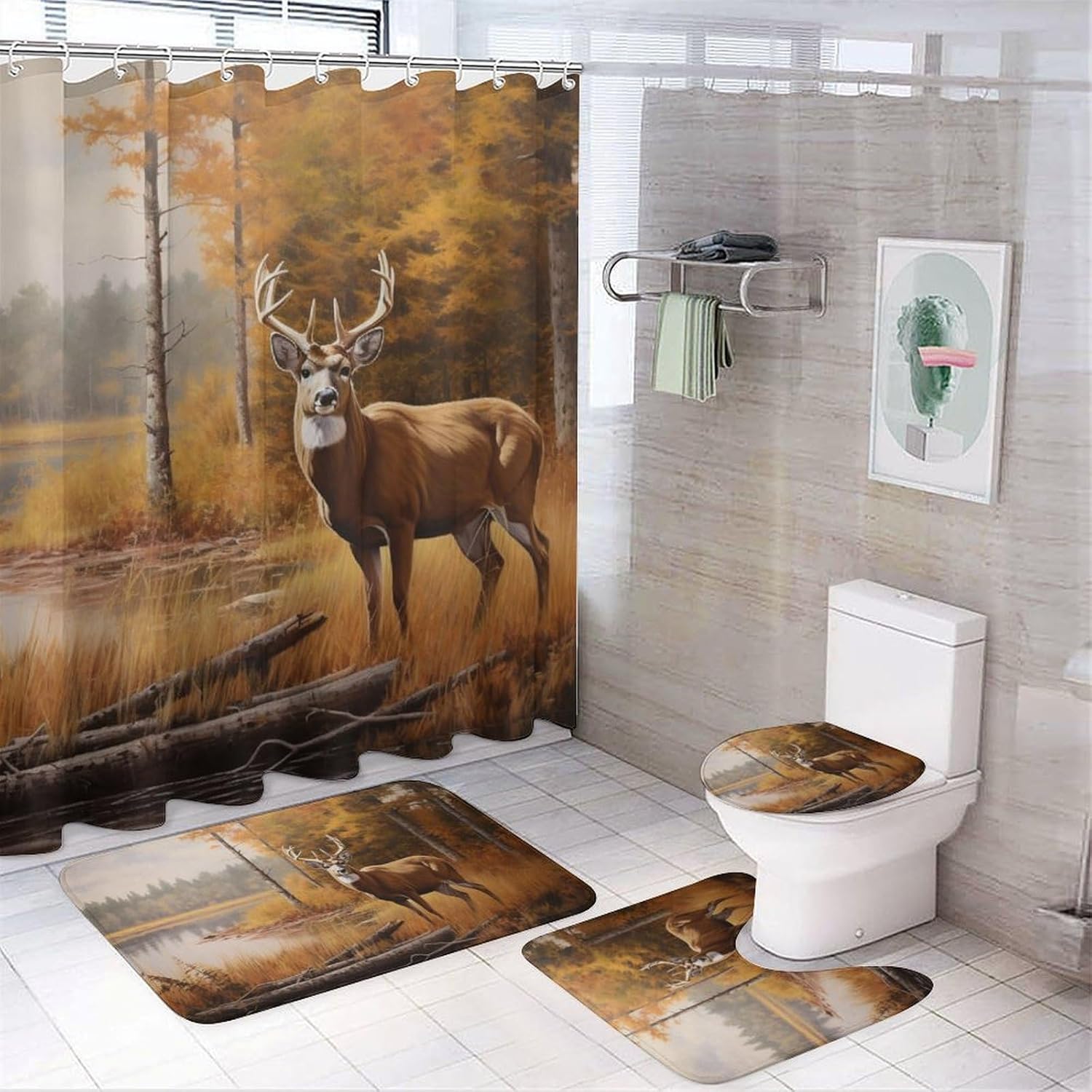 Accessories construction : Shower curtain (with 12 C-shaped plastic hooks)+Floor mat+U-shaped floor mat+Toilet seat cover cover.EASY TO CLEAN: It's very easy to clean and maintain,easy to store and easy to take care of on a daily basis. WATERPROOF: This shower curtain is made of waterproof Oxford cloth, waterproof performance is good, you can avoid water spraying to other places in the bathroom.Applicable Scenarios : Suitable for home bathroom, guest room, bedroom, living room and other places.Washing instructions: washable, not machine washable.After-sales Service:If you are not satisfied with our printed paintings, please feel free to contact us and we will answer you in the shortest possible time. Your satisfaction is our only pursuit.