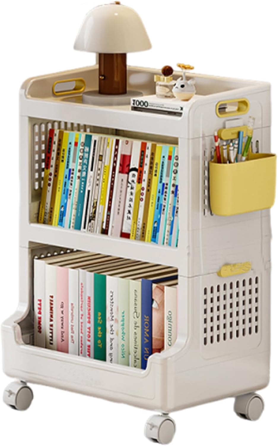 ● This bookshelf comes in two styles: a platform top shelf and a divided top shelf. The divided shelf allows for partitioned storage, while the platform shelf offers more flexible placement.● This movable bookshelf occupies less than 0.1 square meters and is only 30cm wide. It offers storage space along table edges, under tables, in narrow spaces, and in corners, saving space and maximizing space utilization.● This multi-tiered bookshelf provides ample storage for books, toys, snacks, drinks, school supplies, etc. A pen holder can be hung on the side, keeping your home tidy and organized.● This rolling bookshelf features a foldable design. When not in use, it can be folded away for storage, saving space. It can also be stacked and combined to meet various storage needs.● This bookshelf is available in white and beige, classic and versatile colors, suitable for studies, living rooms, offices, bathrooms, kitchens, bedrooms, small spaces, and corners.Product Name: Portable Book CartColors: White, BeigeStyles: 2-tier, 3-tier, Platform, Divided PlatformDimensions: 44*30*61/86.7cmPackage Contents: Portable Book CartNote: Due to manual measurement, there may be an error of 1-3 cm. Please refer to the actual product.Due to differences in lighting, monitors, mobile phones, angles, and individual color perception, the color may vary slightly.